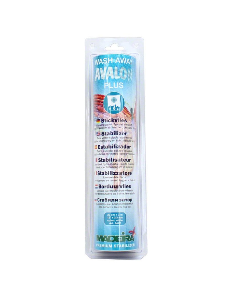 Avalon Plus super résistant - non-tissé hydrosoluble30cm x 3mAvalon Plus est un non-tissé soluble dans l'eau que l'on utilise pour stabiliser la broderie à la machine sur les matières délicates.