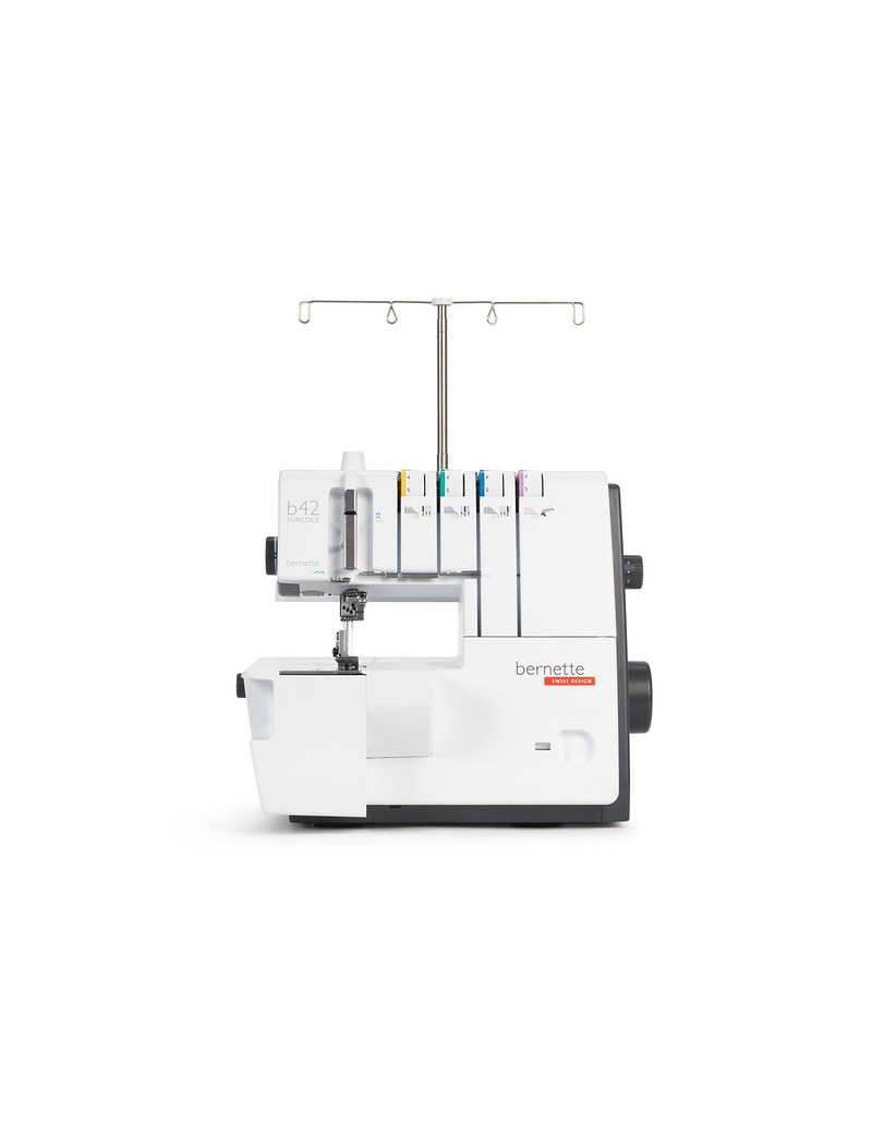 La bernette Funlock 42 est une machine pour point enveloppant qui propose 3 points enveloppants différents d'une largeur comprise entre 2,8 et 5,6 mm et un point de chaînette.